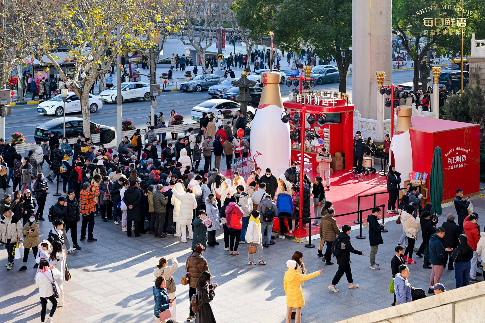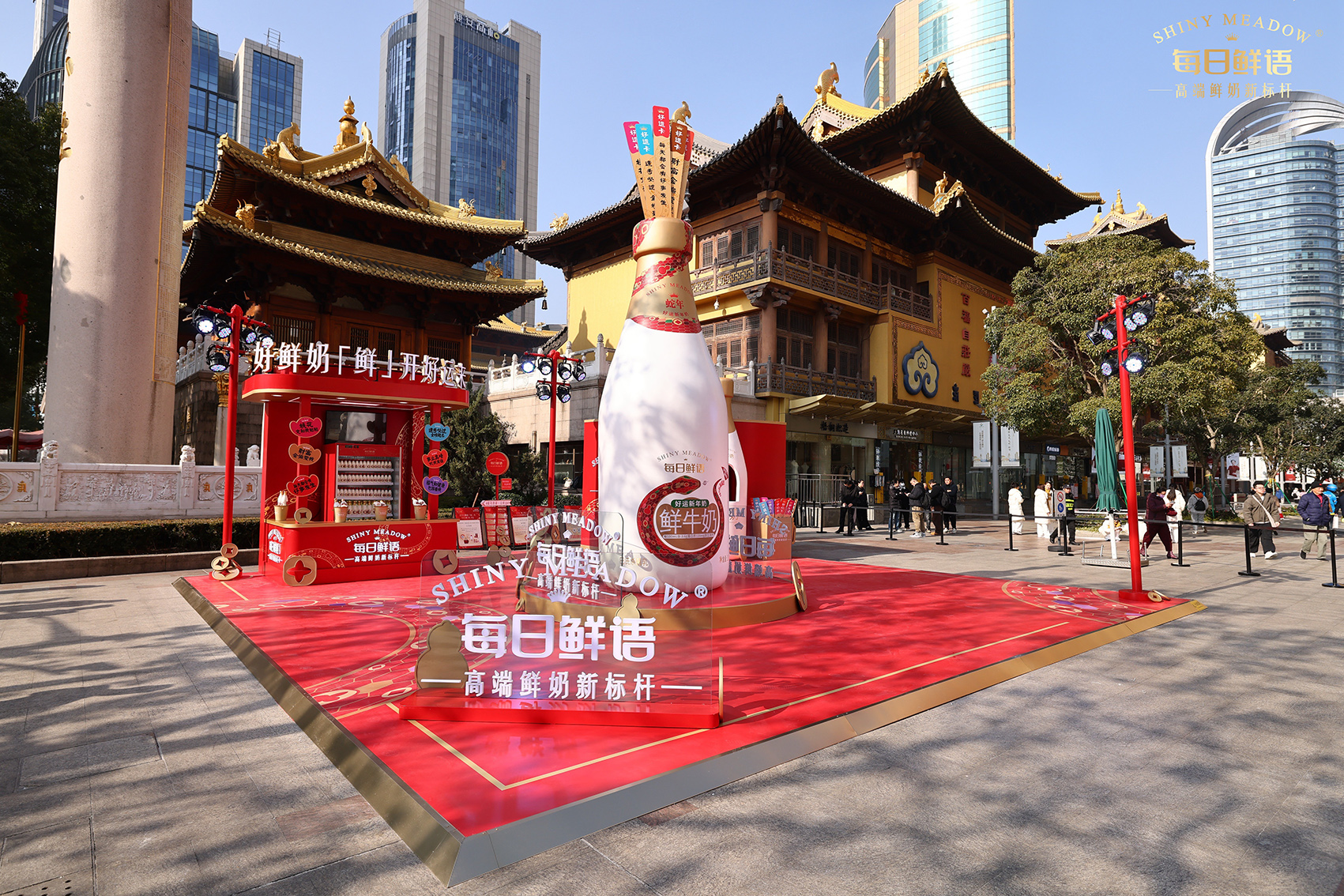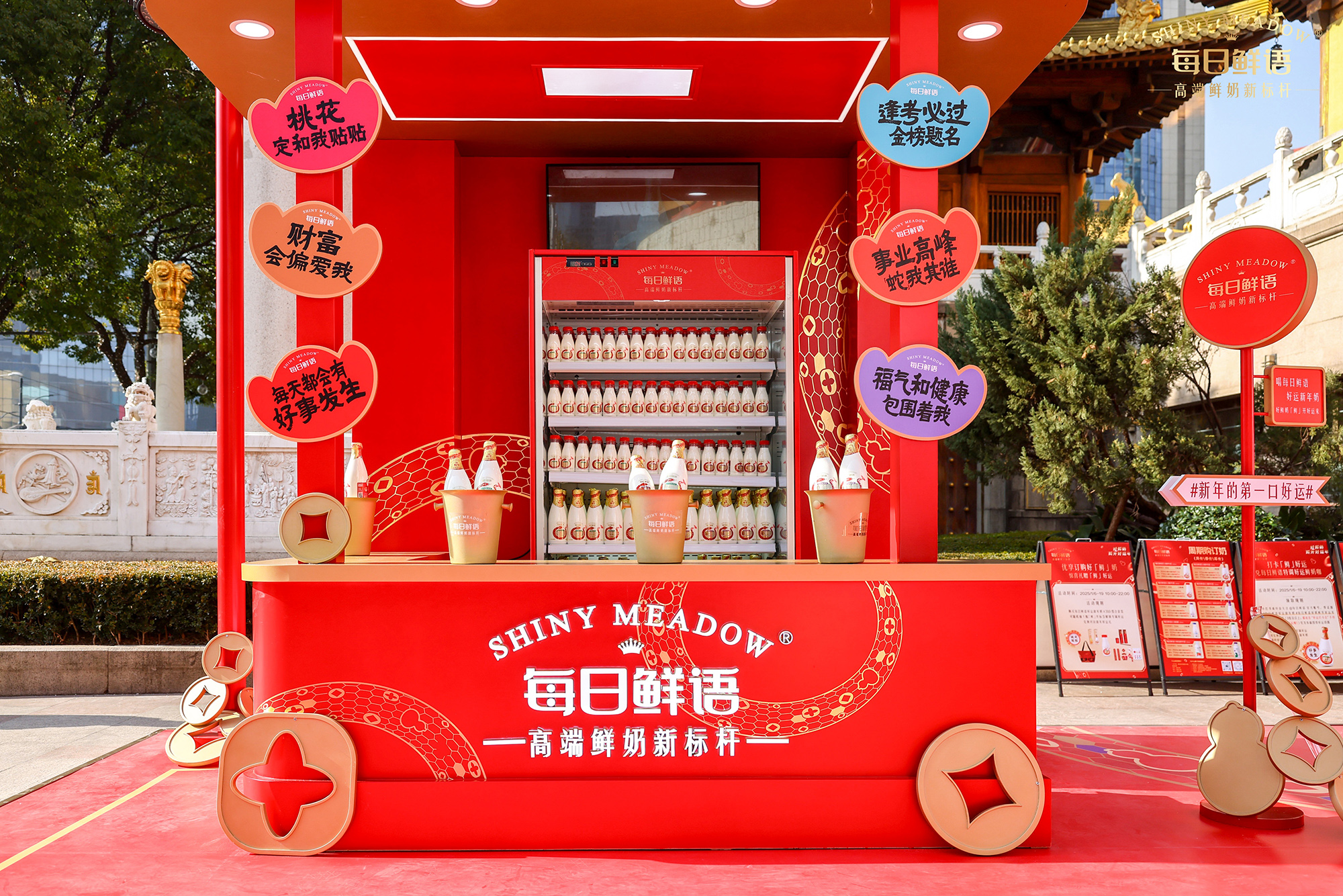 活动坐落于静安寺黄金地段,此次CNY线下快闪是一次成功的品牌营销活动,每日鲜语推出了特别设计的“好运新年奶”,瓶身标签上印有财源滚滚、桃花朵朵开、事业节节高等好运祝福语,为消费者带来新年的美好祝愿.通过创新的展台设计和丰富的互动体验,成功吸引了消费者的关注和参与.活动现场人气爆棚,吸引了大量市民前来参与和购买。