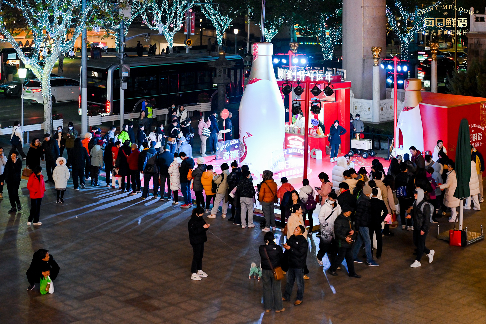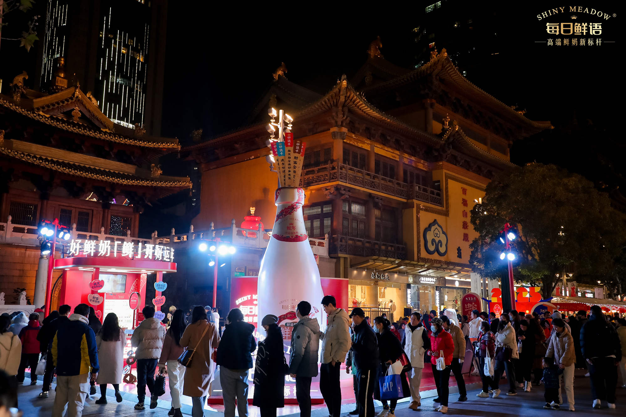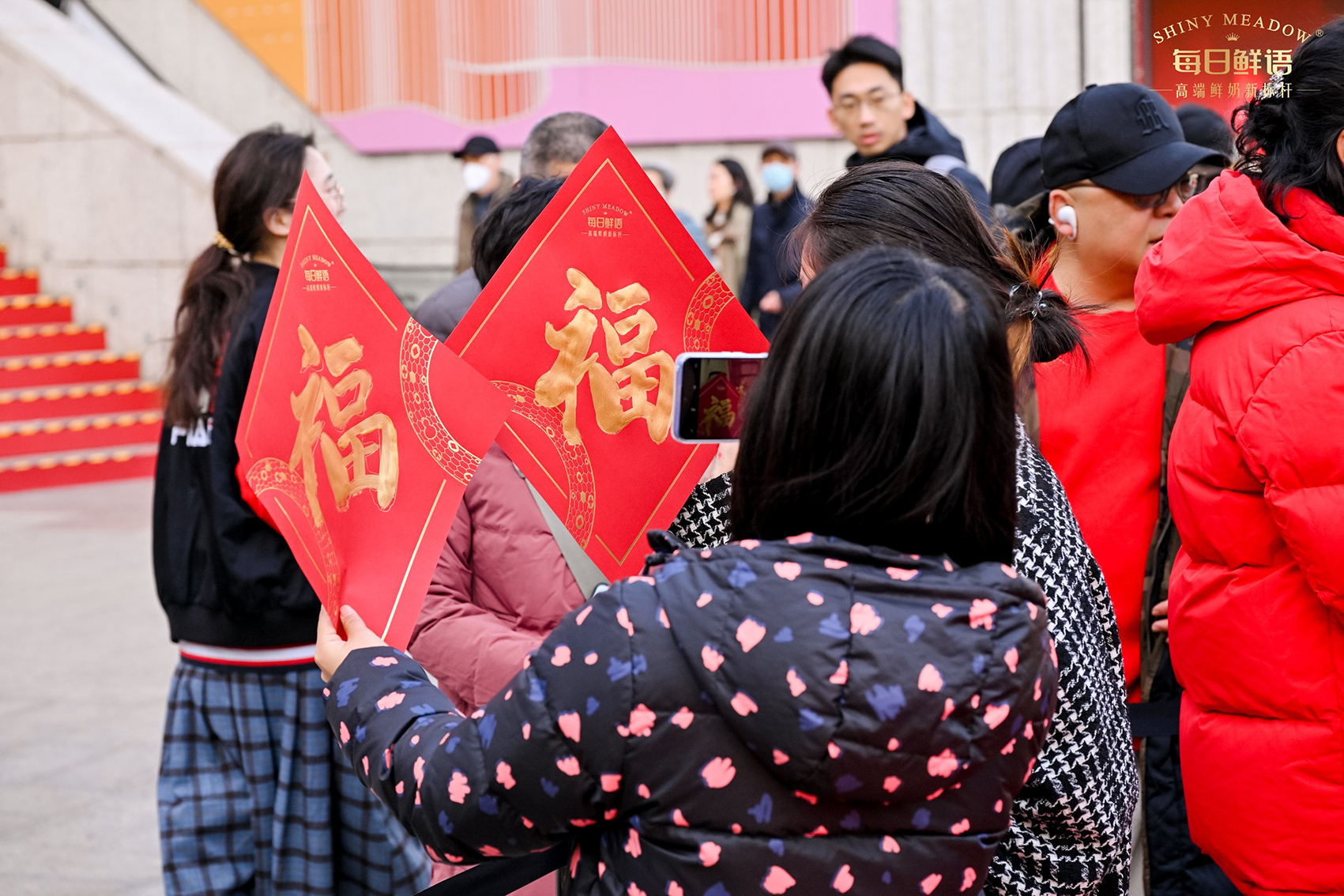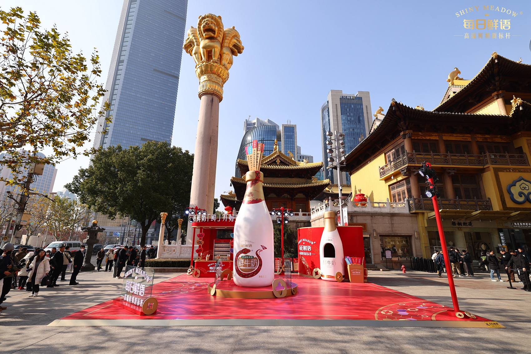 活动坐落于静安寺黄金地段,此次CNY线下快闪是一次成功的品牌营销活动,每日鲜语推出了特别设计的“好运新年奶”,瓶身标签上印有财源滚滚、桃花朵朵开、事业节节高等好运祝福语,为消费者带来新年的美好祝愿.通过创新的展台设计和丰富的互动体验,成功吸引了消费者的关注和参与.活动现场人气爆棚,吸引了大量市民前来参与和购买。